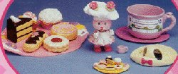 with rose decal on front --white apron with pink trim --white baker's hat --child-sized plastic donut with pink frosting and yellow sprinkles --child-sized long john with chocolate frosting and a frosting rose in the middle --child-sized cookie with frilled edges and dark pink jelly in the middle --child-sized cupcake in lavender cup with white frosting --child-sized slice of cherry pie with scoop of white and dark pink ice cream on top --child-sized slice of double-decker vanilla cake with chocolate frosting and white swirls on top --child-sized lavender tray with molded pastel-colored flowers on each side --miniature plastic donut with pink frosting and yellow sprinkles --miniature long john with chocolate frosting and a frosting rose in the middle --miniature cookie with frilled edges and dark pink jelly in the middle --miniature cupcake in lavender cup with white frosting --miniature slice of cherry pie with scoop of white and dark pink ice cream on top --miniature slice of double-decker vanilla cake with chocolate frosting and white swirls on top --miniature yellow tray with molded pastel-colored flowers on each side --pastel-yellow hat with upturned brim on front and molded flowers --small pale pink teacup --dark pink tray |