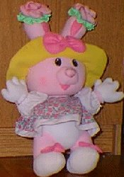 | ? (possibly didn't have a name) | pale lavender; one ear has a pink rose and the other a blue rose | Cupcake Nursery Crib (lavender cupcake bottom; white cupcake top with lavender icing around the edges and two roses on the top) | --lace